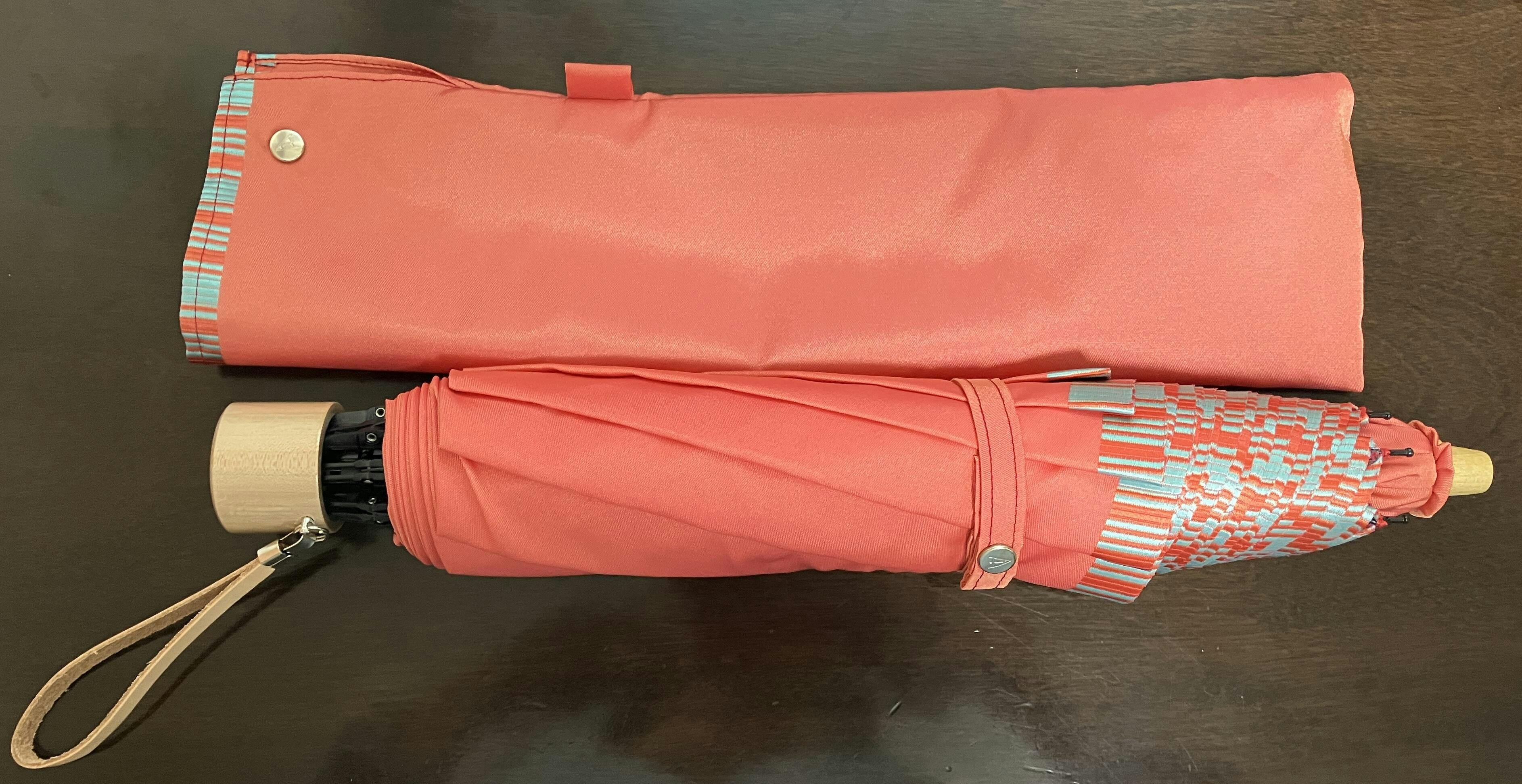 This folding umbrella can be used in both rain and shine, with a two-tone chambray sheen that changes color depending on the light. The striped design woven into the edge is an accent, and the fabric is stylish and luxurious, yet lightweight.