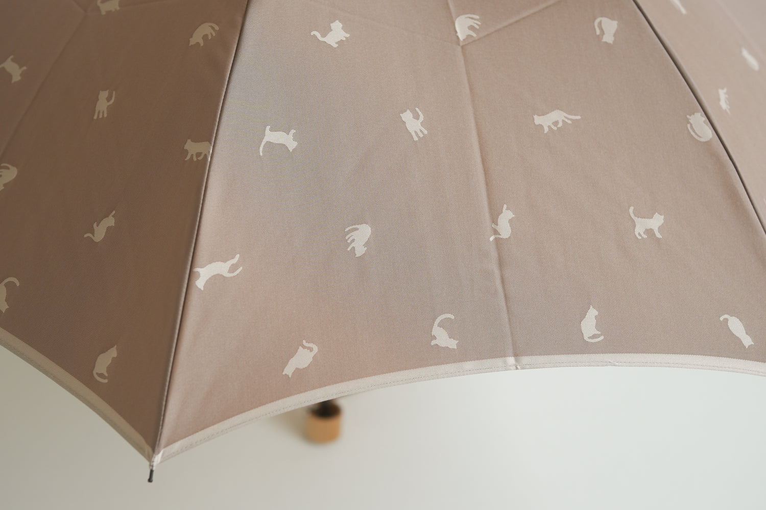 This rain and shine umbrella features a jacquard weave that recreates the silhouettes of cats standing in a sunlit spot. Another attractive feature is that the colors on the front and back of the woven fabric are reversed.