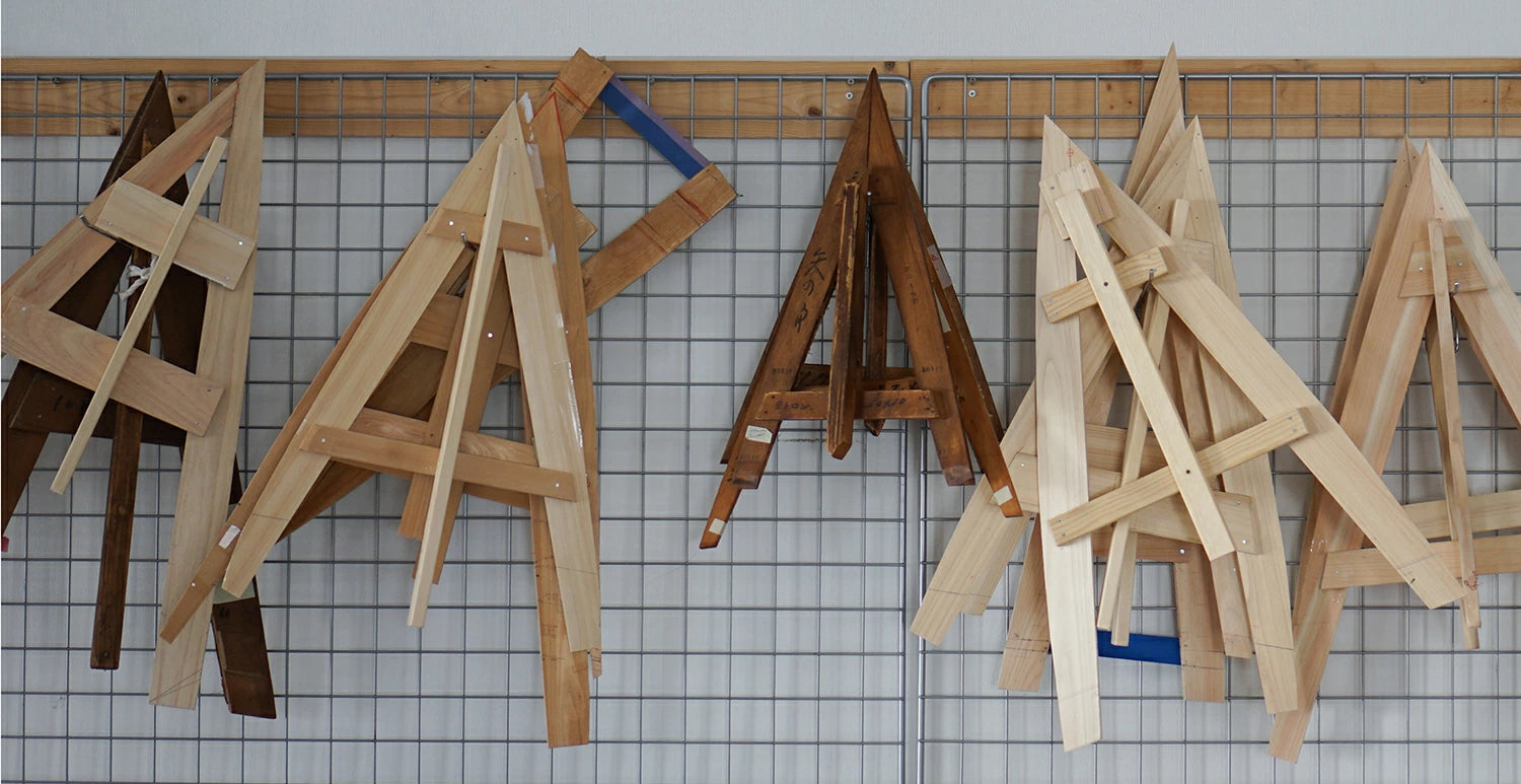 Komiya Shoten's brand logo, the "kata" mark, has been incorporated into the fabric design. A kata is a curved triangular wooden mold used when cutting fabric, and craftsmen create one for each type of umbrella. The length and angle of the wooden mold is adjusted down to the millimeter to match the fabric and frame, and the carefully selected mold is completed after repeated trial and error. The soul of the craftsman is infused into this, producing the beautiful umbrella shape that Komiya Shoten has been committed to since its founding. The spirit of the brand lives on in the design of this umbrella, which features the wooden mold logo.