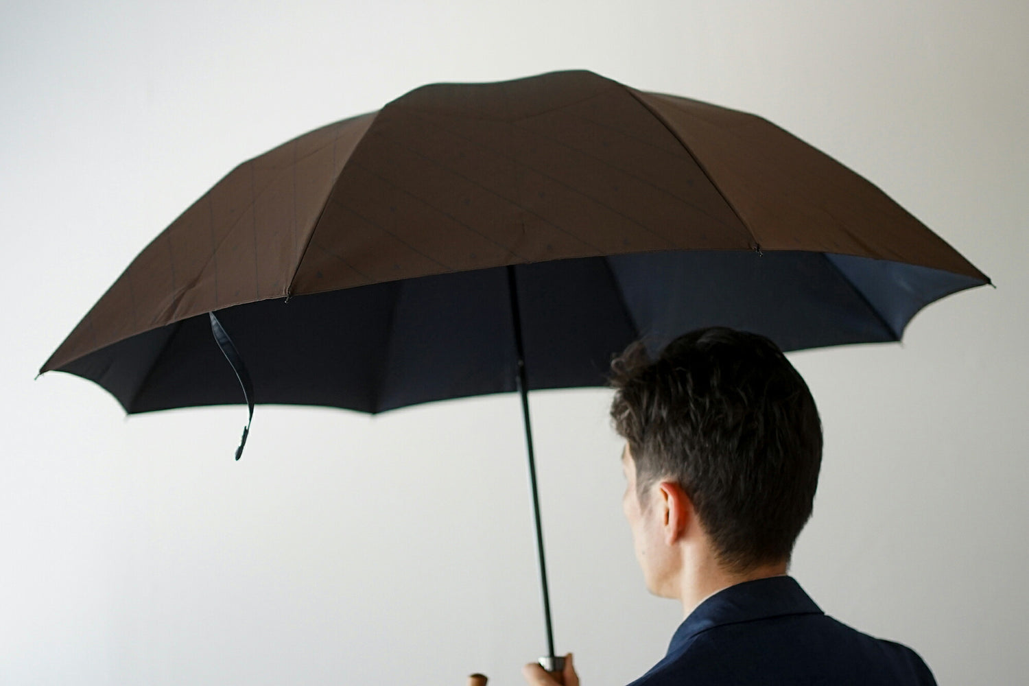Regimental stripes (diagonal stripes), which have long been used as a necktie pattern, are expressed in Koshu-ori jacquard. The fabric is designed using classic colors for men's suits, making it easy to match with other clothes, and the subtle stripes and wooden logo create a sophisticated and playful look. This umbrella is easy to incorporate into everyday outfits, such as a suit or a casual blazer and pants style, making rainy days even more fun. The jacquard weave, with reversed colors on the front and back, makes the inside of the umbrella beautiful as well, making it a piece that will make you look forward to rainy days.