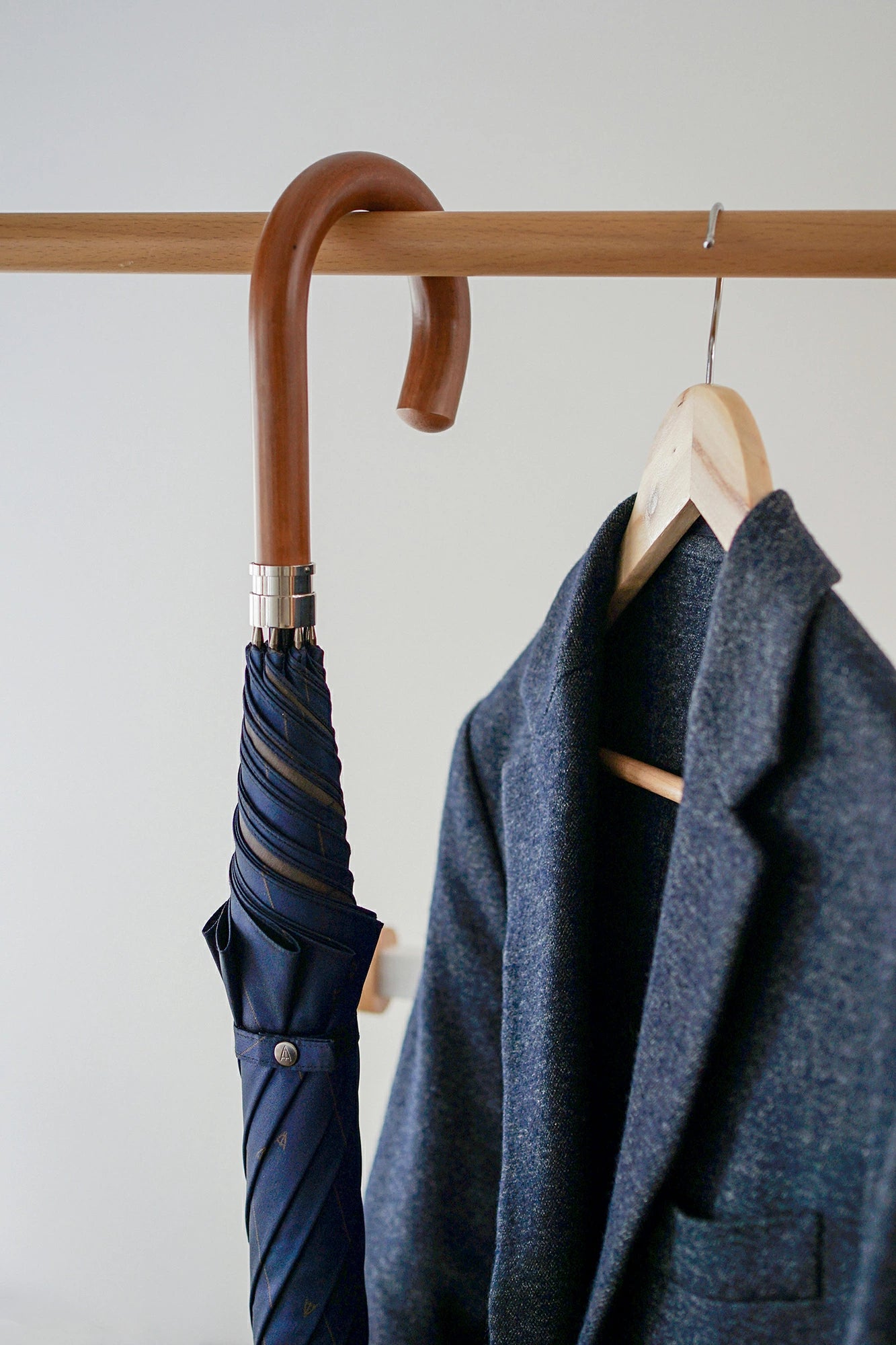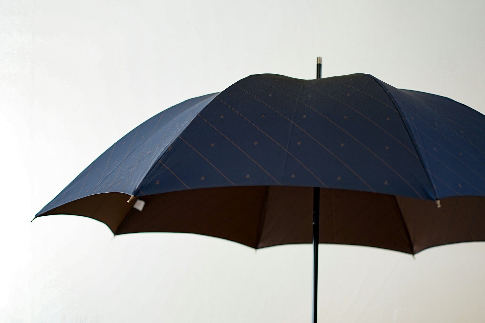 Regimental stripes (diagonal stripes), which have long been used as a necktie pattern, are expressed in Koshu-ori jacquard. The fabric is designed using classic colors for men's suits, making it easy to match with other clothes, and the subtle stripes and wooden logo create a sophisticated and playful look. This umbrella is easy to incorporate into everyday outfits, such as a suit or a casual blazer and pants style, making rainy days even more fun. The jacquard weave, with reversed colors on the front and back, makes the inside of the umbrella beautiful as well, making it a piece that will make you look forward to rainy days.