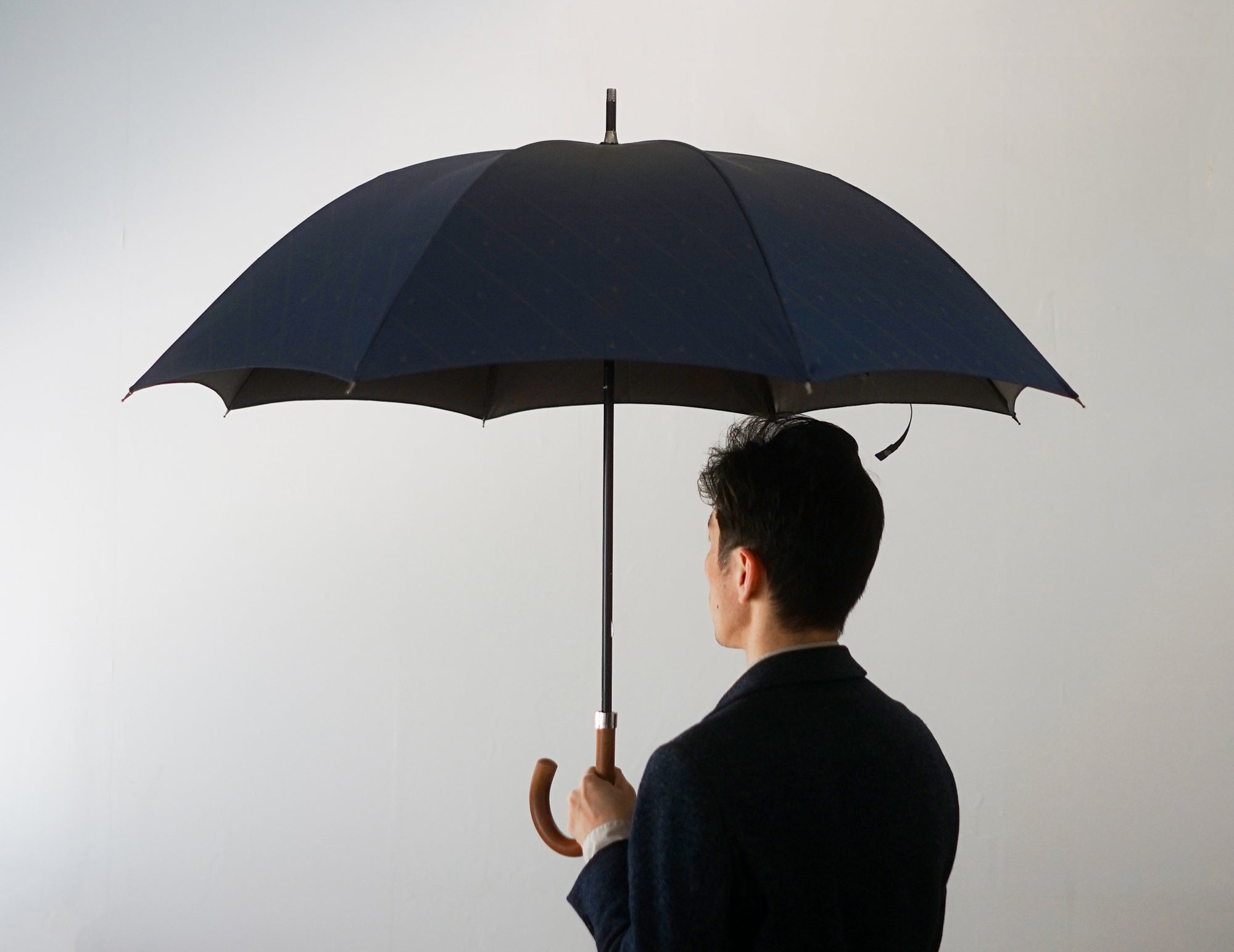 A stylish long umbrella with a slim silhouette The 65cm rib is just the right size for a men's long umbrella, with a beautiful slim silhouette that makes it stylish to carry around. The combination of carbon ribs and jacquard fabric makes it lightweight.