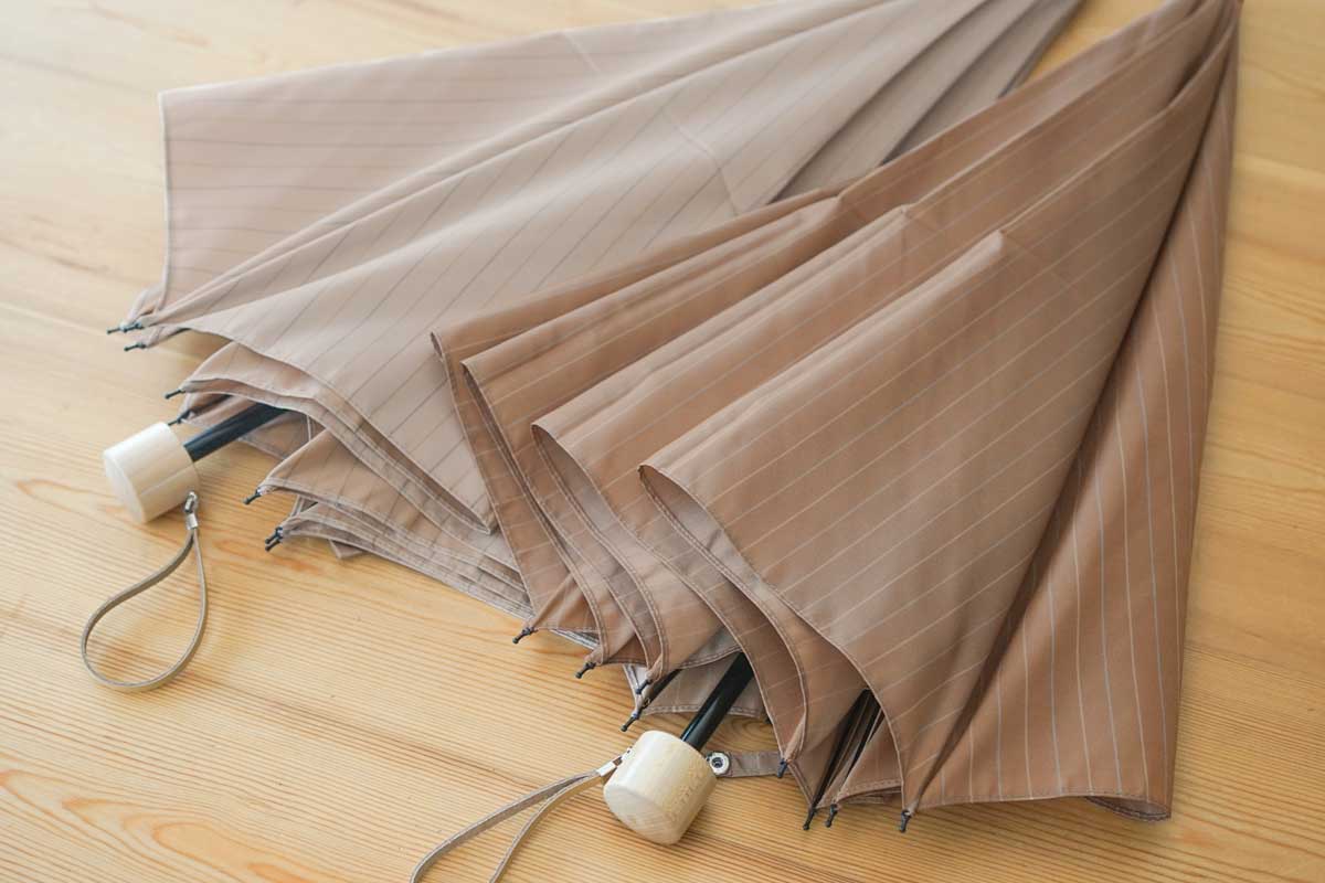This umbrella is made of beige-based Koshu-ori fabric and is unisex in size, making it suitable for both rain and shine. The elegant and simple striped pattern is made with Yamanashi dobby weaving, giving it the appealing luster that only yarn-dyed fabric can provide, and it exudes a sense of luxury despite its lightweight fabric.