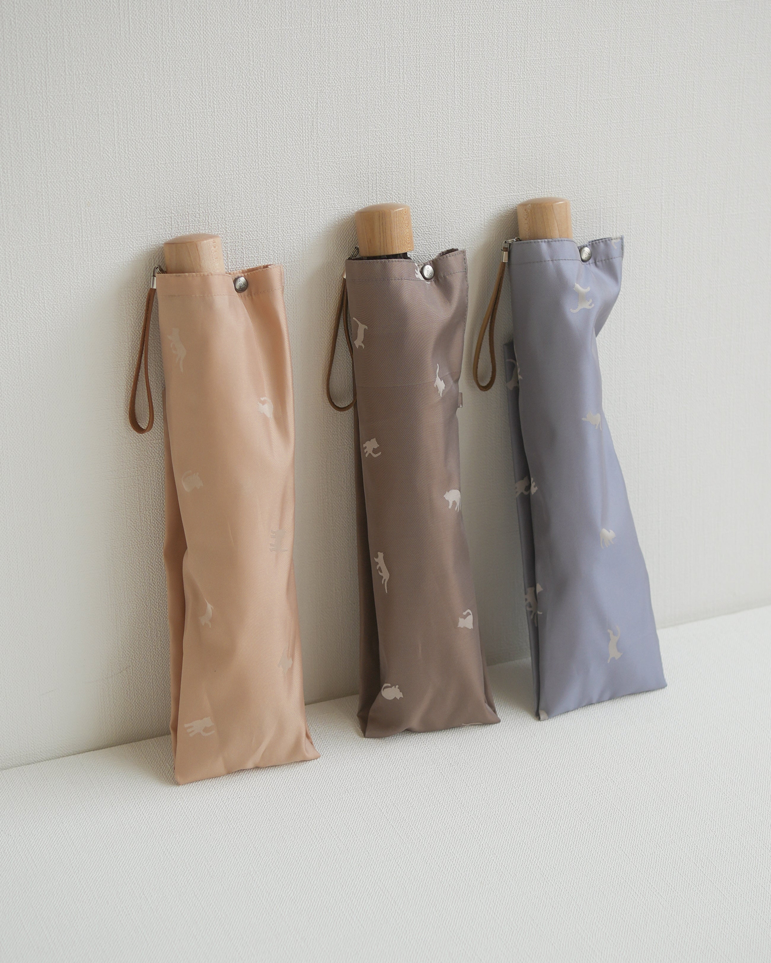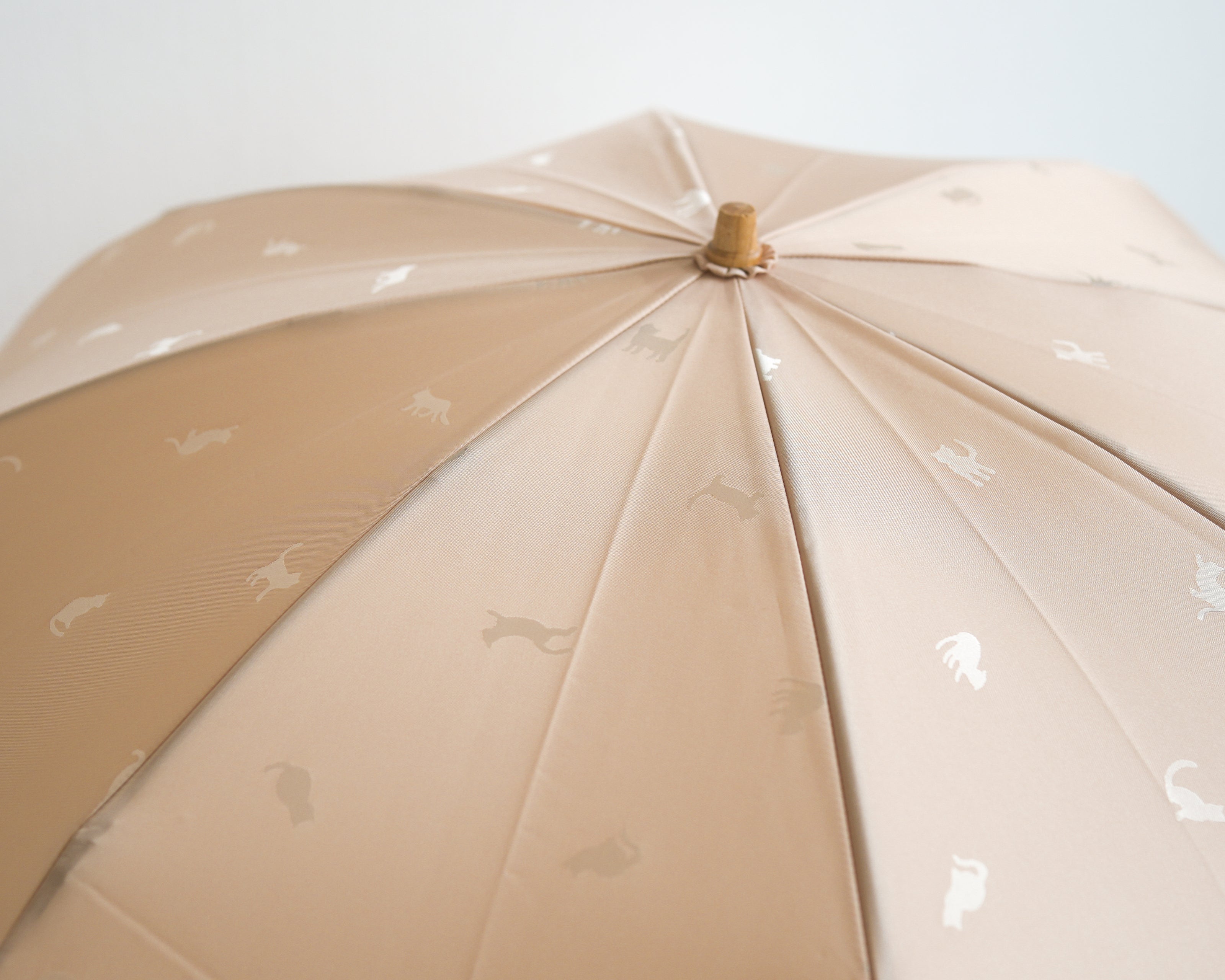 陽だまりの中にたたずんでいるような、ねこたちのシルエットをジャカード織で再現した雨晴兼用傘です。 織り上げた生地の表と裏の色の出方が反転するのも魅力です。