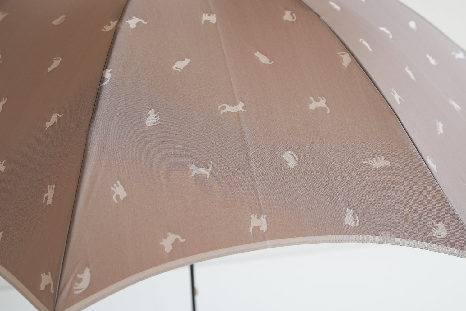 陽だまりの中にたたずんでいるような、ねこたちのシルエットをジャカード織で再現した雨晴兼用傘です。 織り上げた生地の表と裏の色の出方が反転するのも魅力です。