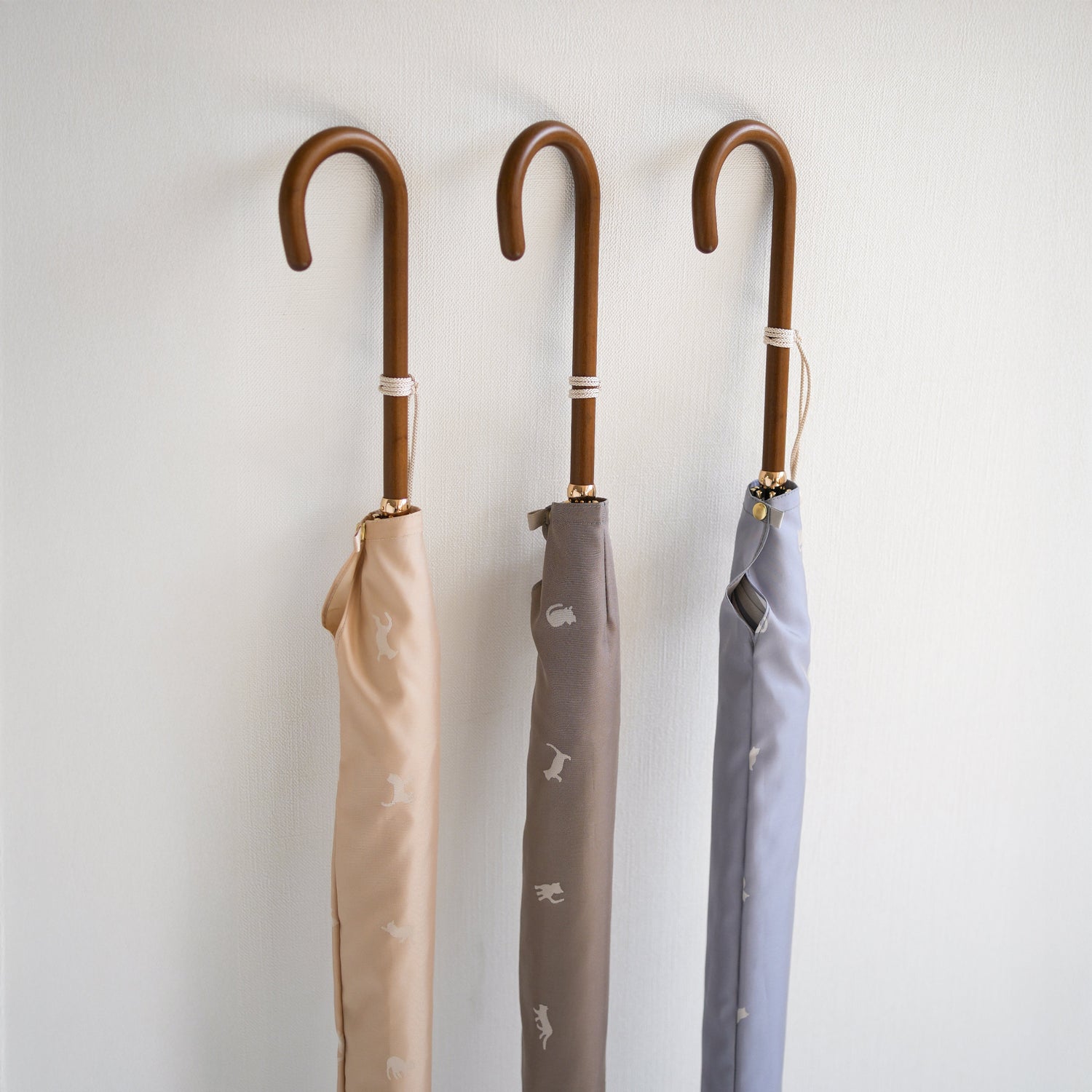 猫ちゃんたちのかわいらしい仕草をシルエットで表現することで、今日はどんな表情をしているかな?と想像しながら、使うのが楽しくなる傘になりました。さりげないネコのデザインなので、どのカラーバリエーションも、おしゃれにお使いいただけます。