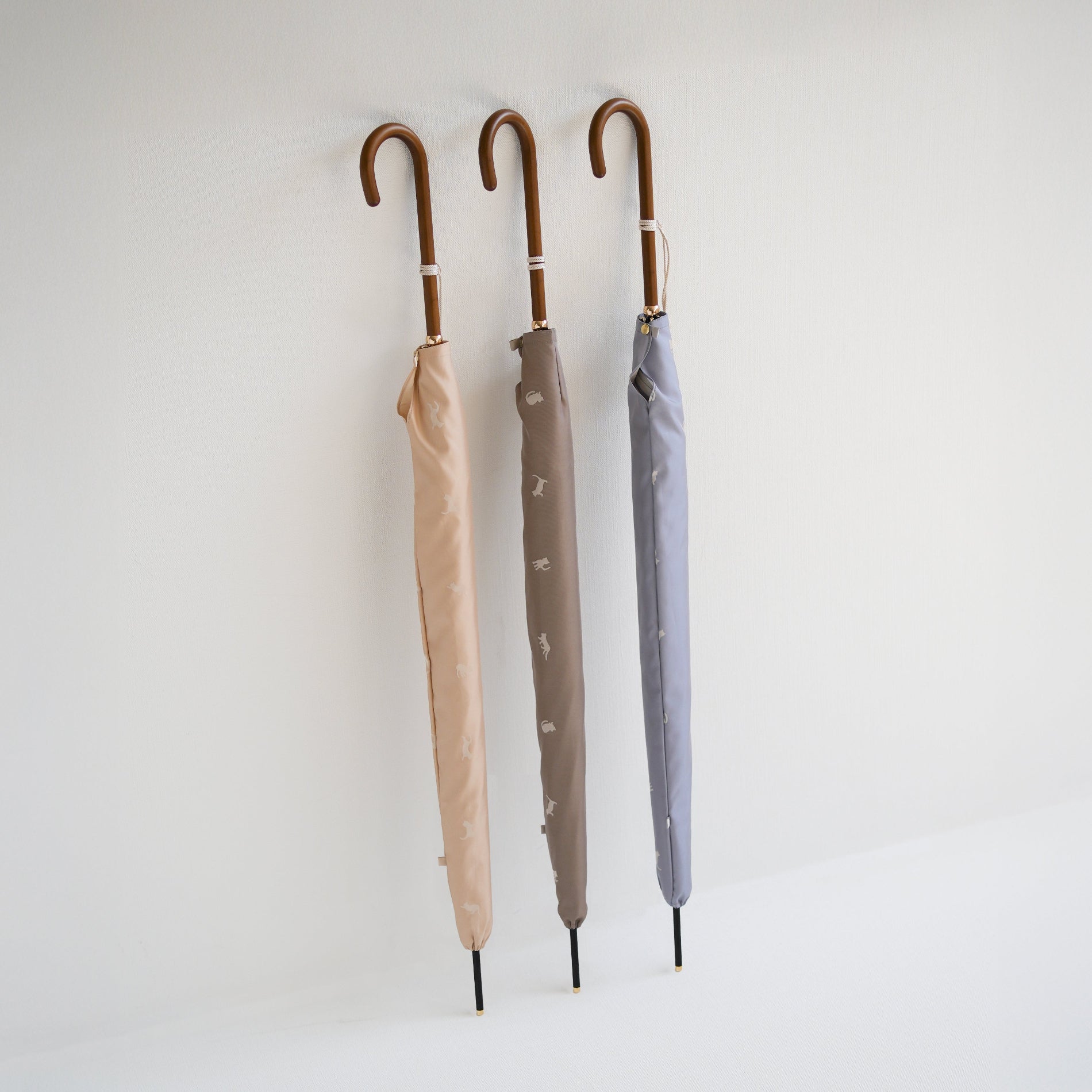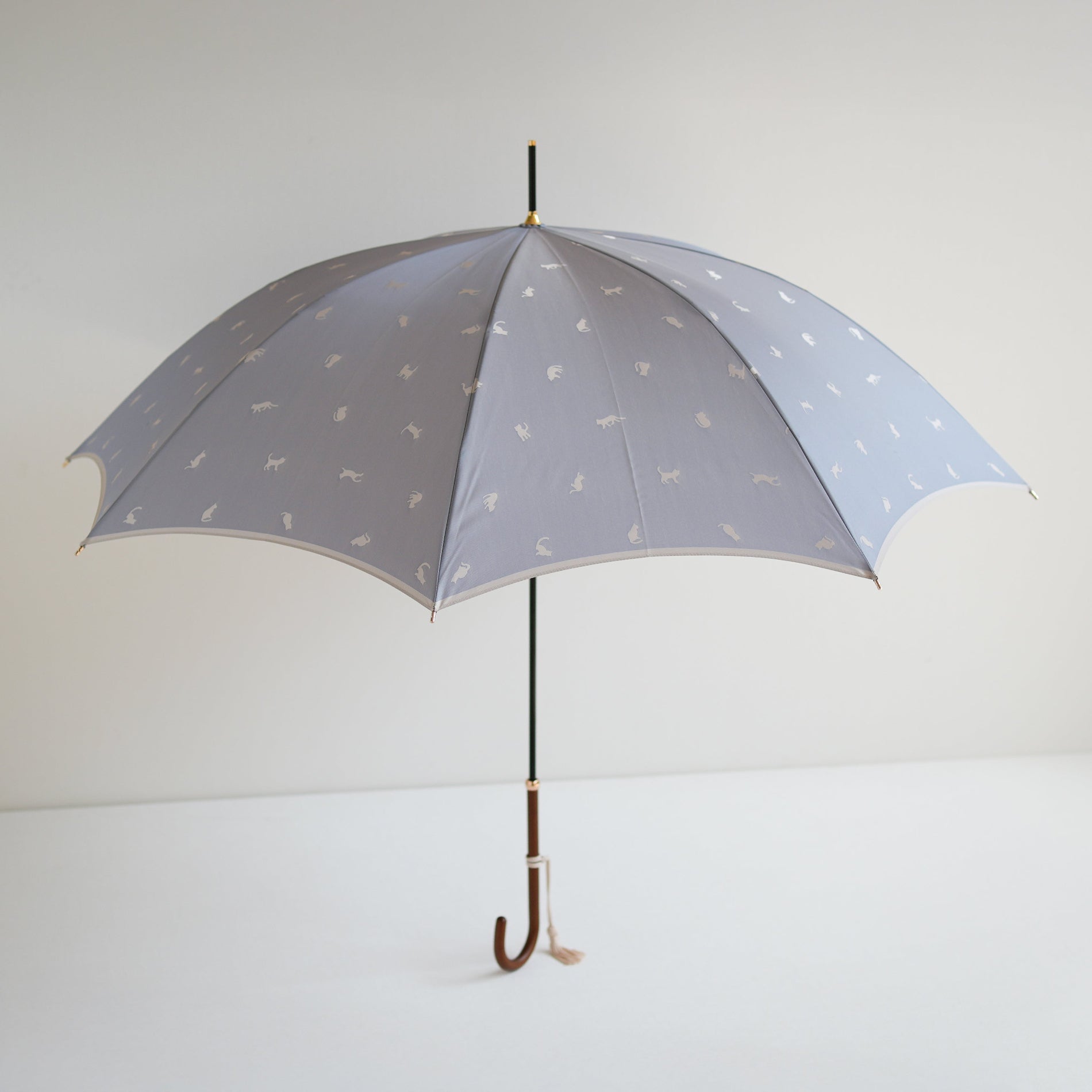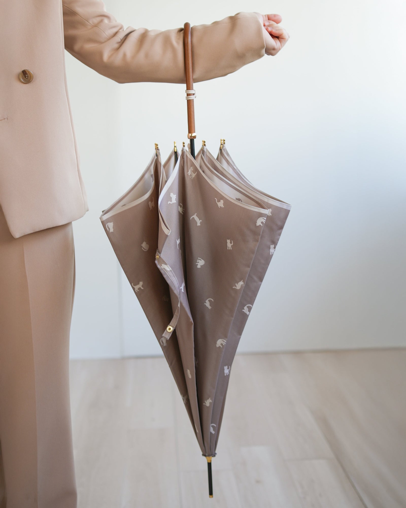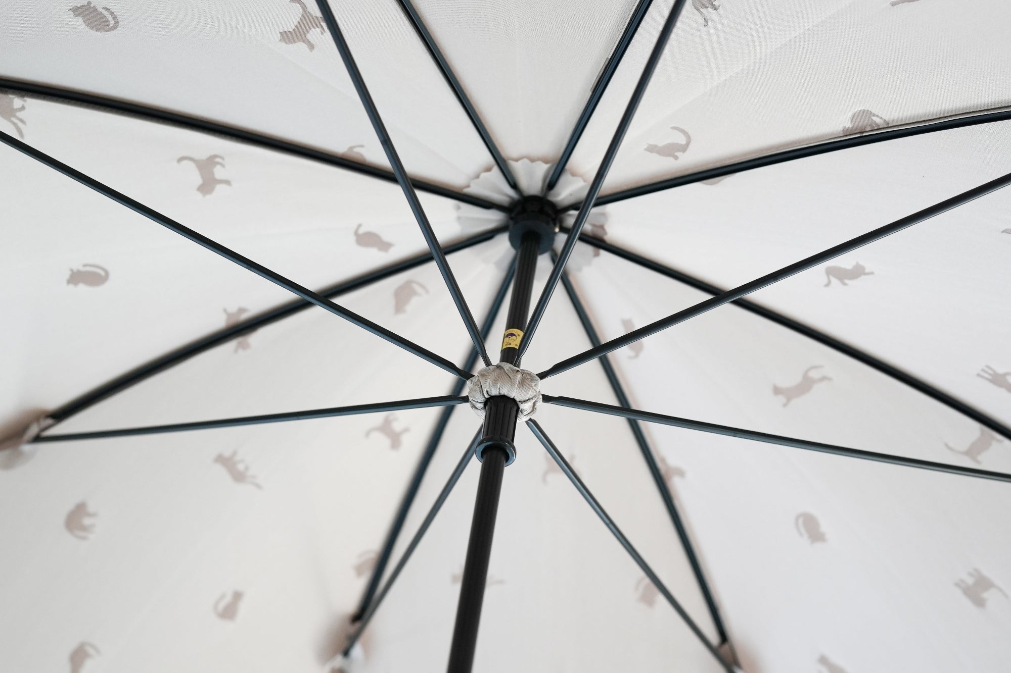 猫ちゃんたちのかわいらしい仕草をシルエットで表現することで、今日はどんな表情をしているかな?と想像しながら、使うのが楽しくなる傘になりました。さりげないネコのデザインなので、どのカラーバリエーションも、おしゃれにお使いいただけます。
