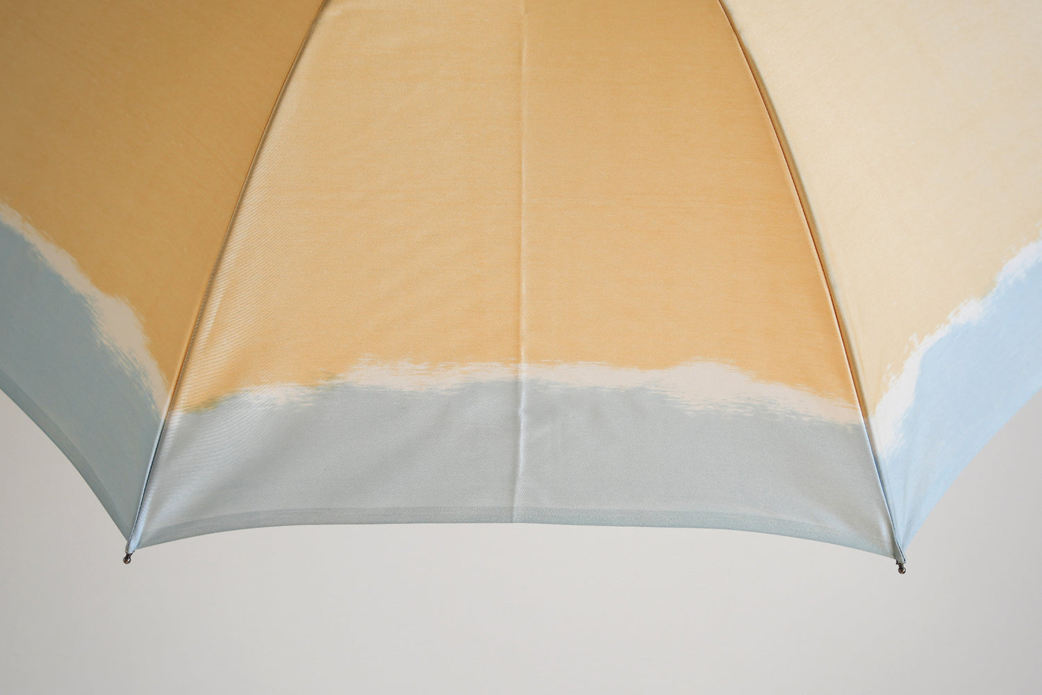 実際の染模様のデザインで捺染型を製作し、仮織をした経糸に捺染を行ない、最後はそれを「ほぐし織」の技術で織模様で表現した甲州織の雨晴兼用傘です。仮織した糸を抜き取りながら織り上げていくことで、境界線がゆらぎ、2色が溶け込むような傘生地が出来上がりました。植物や果実などの自然がもつそれぞれの色を取り入れたカラーバリエーションのため、主張しすぎない明るさと色どりで、ライフスタイルや現代のファッションに合わせやすい傘になりました。