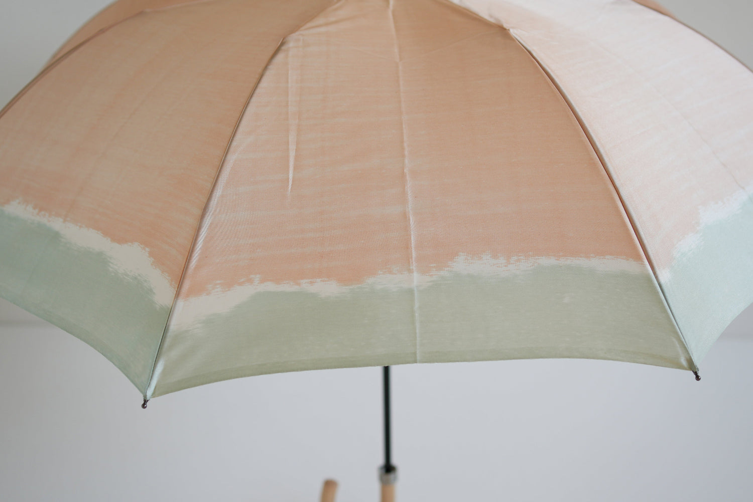 実際の染模様のデザインで捺染型を製作し、仮織をした経糸に捺染を行ない、最後はそれを「ほぐし織」の技術で織模様で表現した甲州織の雨晴兼用傘です。仮織した糸を抜き取りながら織り上げていくことで、境界線がゆらぎ、2色が溶け込むような傘生地が出来上がりました。植物や果実などの自然がもつそれぞれの色を取り入れたカラーバリエーションのため、主張しすぎない明るさと色どりで、ライフスタイルや現代のファッションに合わせやすい傘になりました。