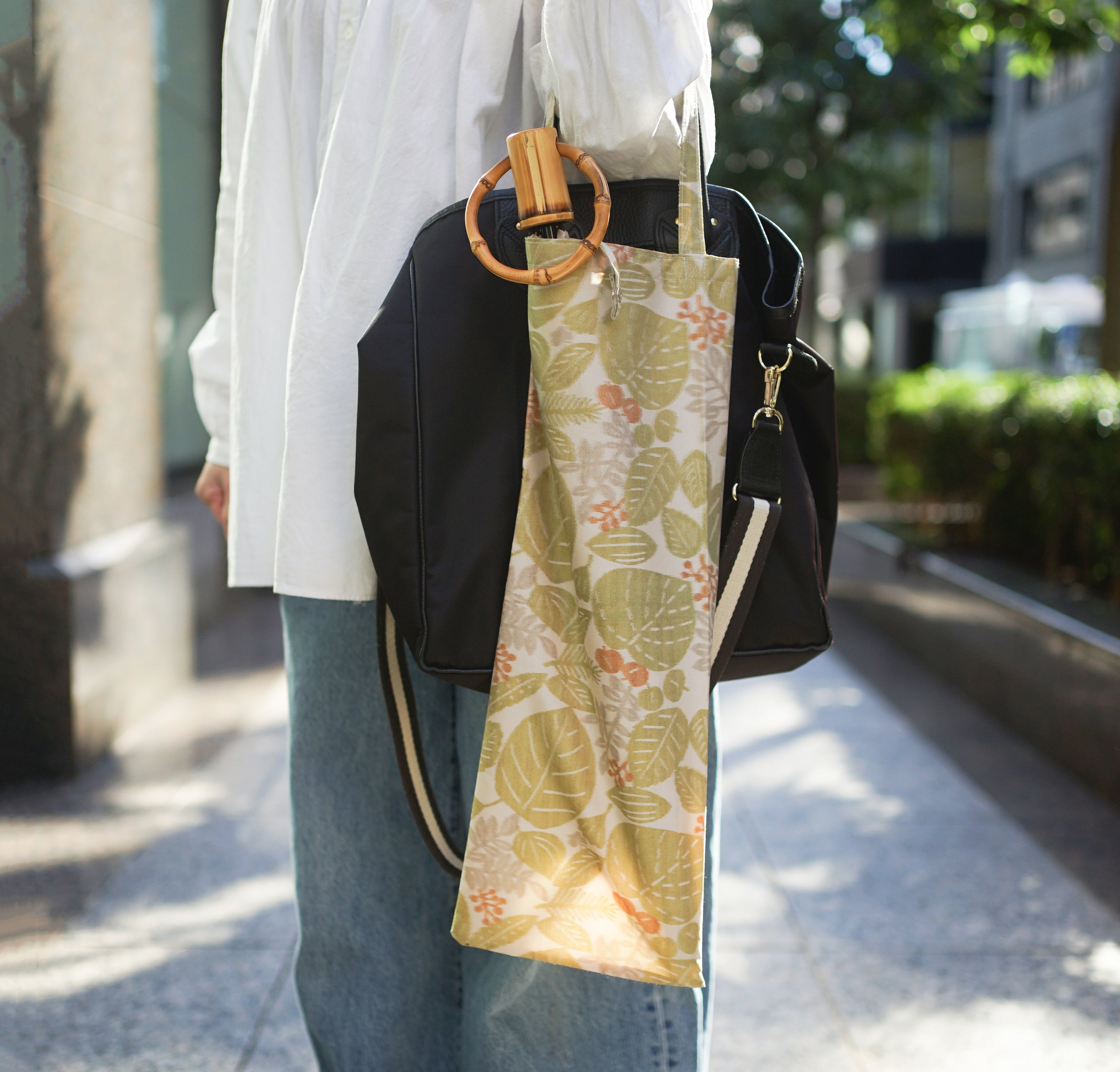 折りたたみ傘の傘袋は、エコバッグの形になっており、長傘のように閉じていただいた傘を入れていただくのはもちろん、お買い物の際のエコバッグとしてもご利用いただけます。
