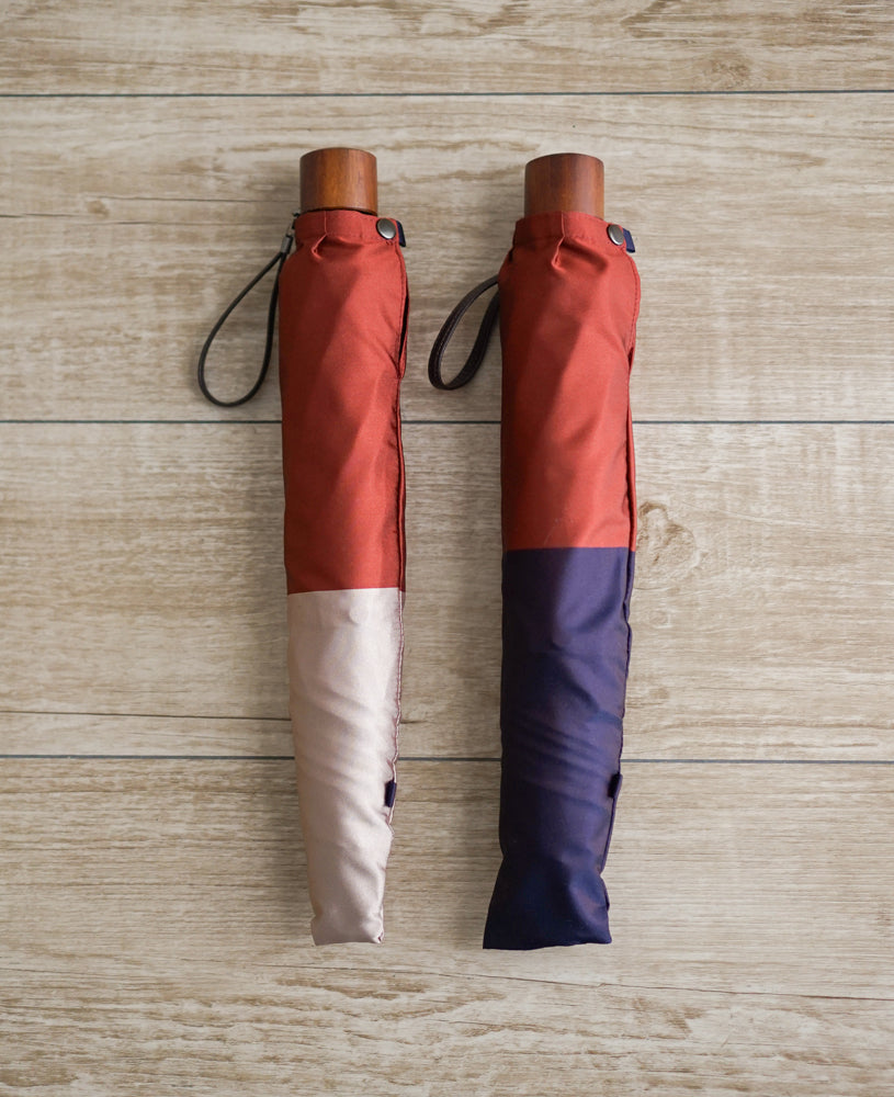 甲州織独特の上品な光沢感とシングル織ならではの軽量感が合わさった、機能的かつデザイン性の高い雨晴兼用傘です。どんな洋服にも馴染む3色の組み合わせが、デイリー使用にぴったりな、コンパクトで軽い雨晴兼用折りたたみ傘です。