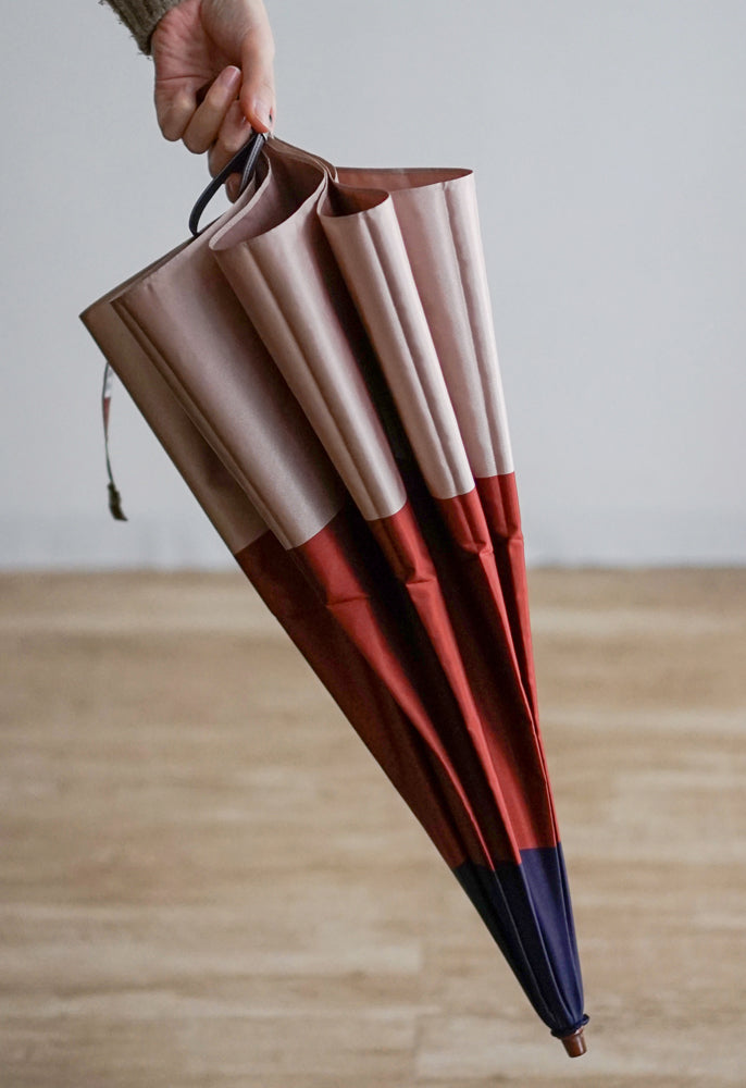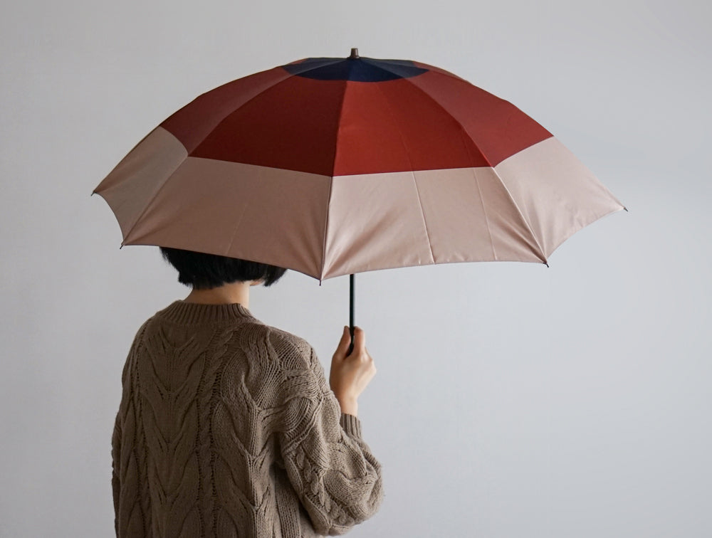 どんな洋服にも馴染む3色の組み合わせが、傘になったときにボーダーのようなデザインになりました。デイリー使用にぴったりな、雨晴兼用折りたたみ傘です。