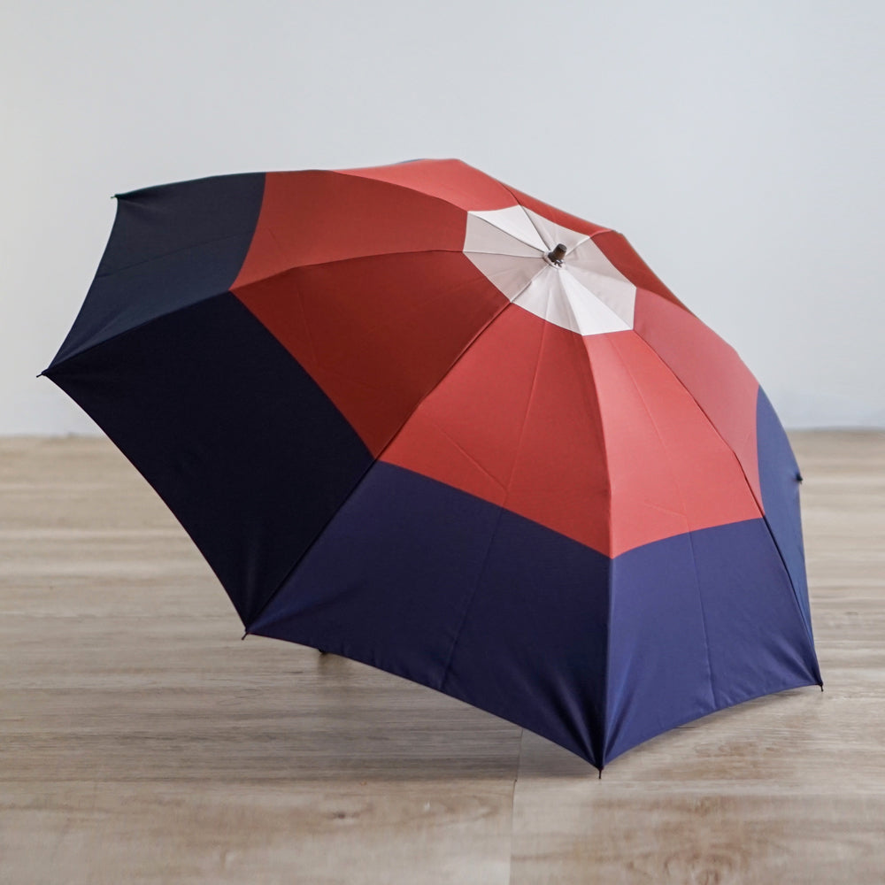 このシリーズは、3色の先染め糸を、太めのボーダーのデザインになるよう織り上げました。 甲州織独特の上品な光沢感とシングル織ならではの軽量感が合わさった、実用的かつデザイン性の高い雨晴兼用傘です。