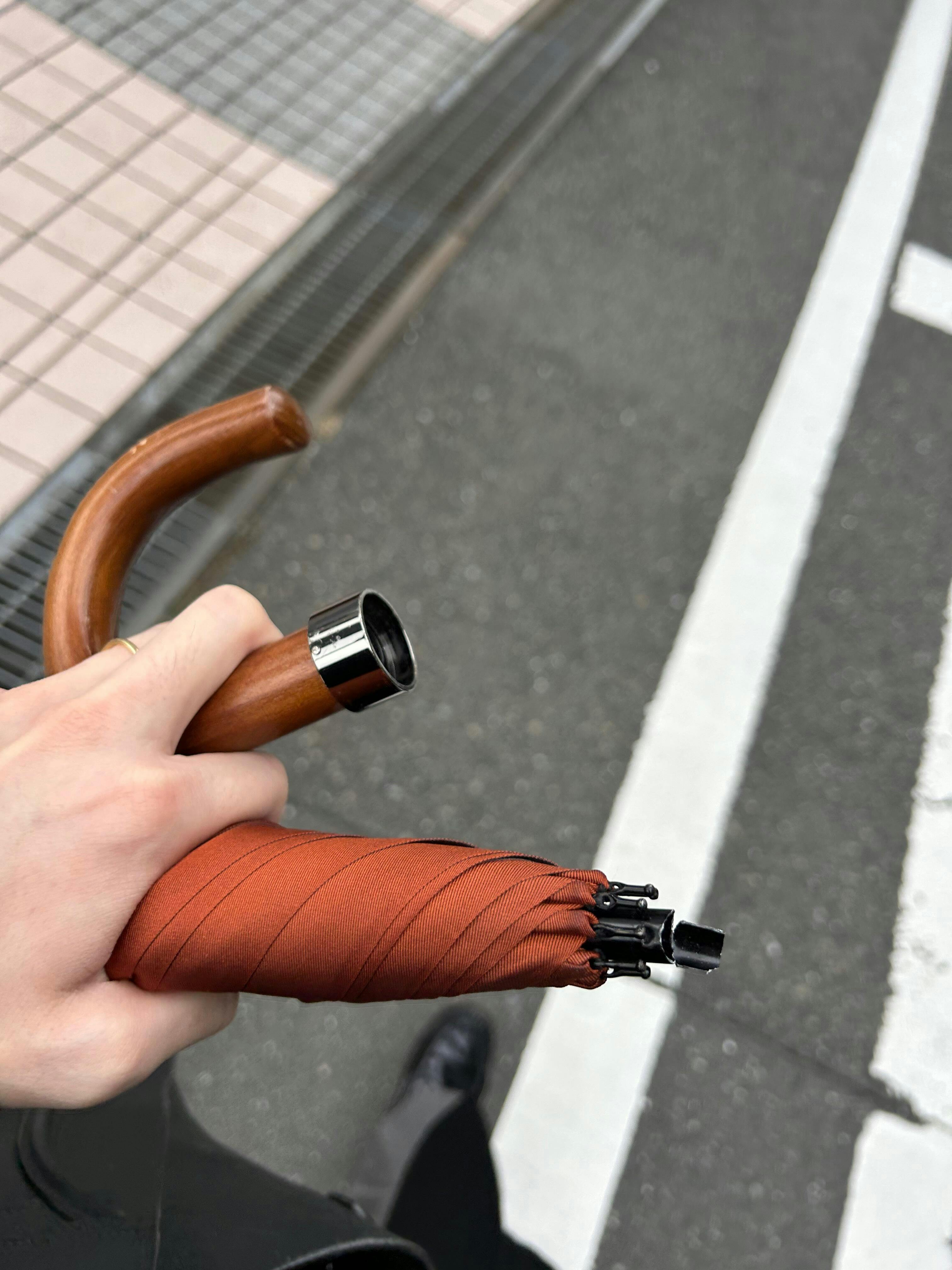 持ちやすく、紳士の折り畳み傘らしいサイズ感で手にもかけられる曲がり手元は、上品な存在感があり、手にするだけでいつものコーディネートに品格をプラスしてくれます。