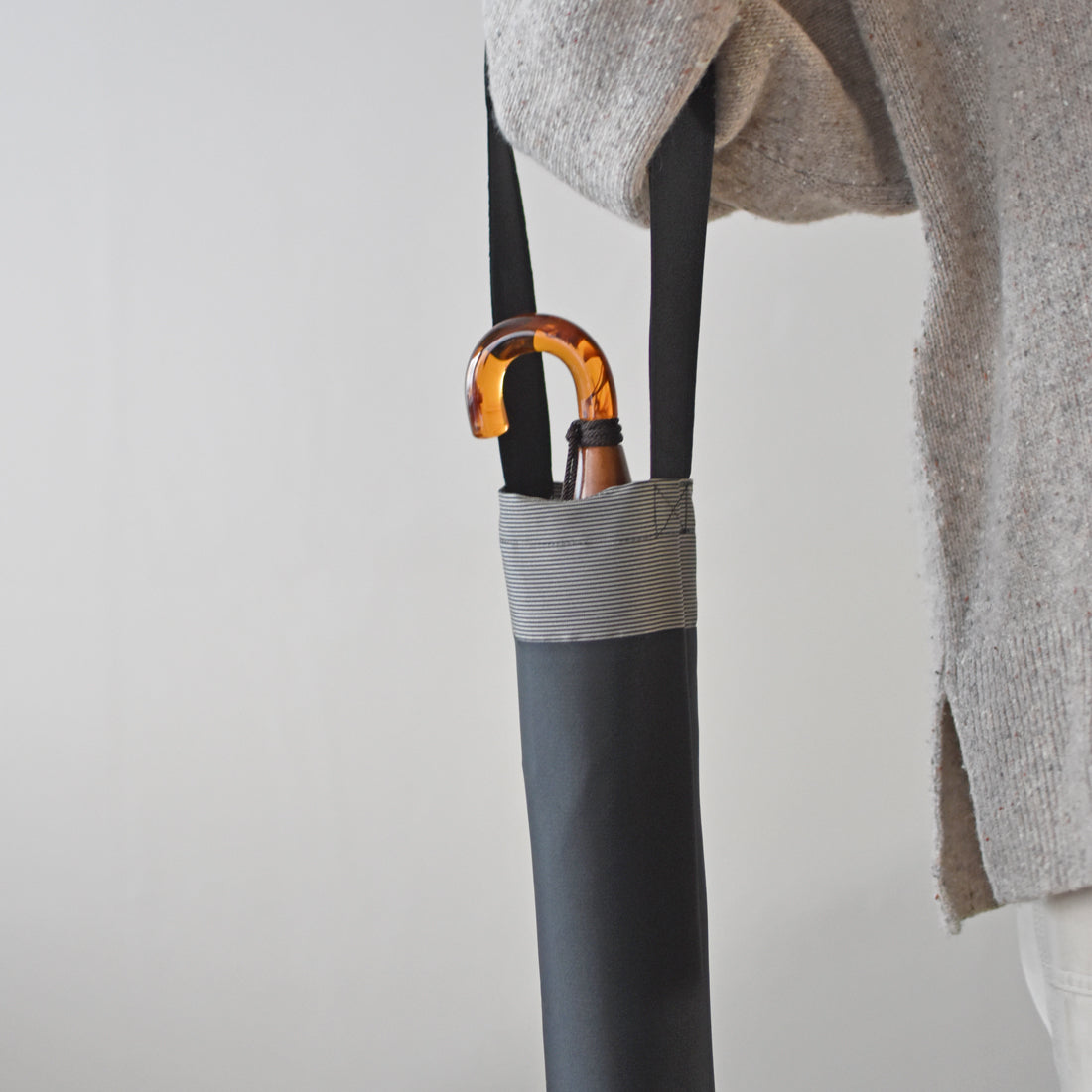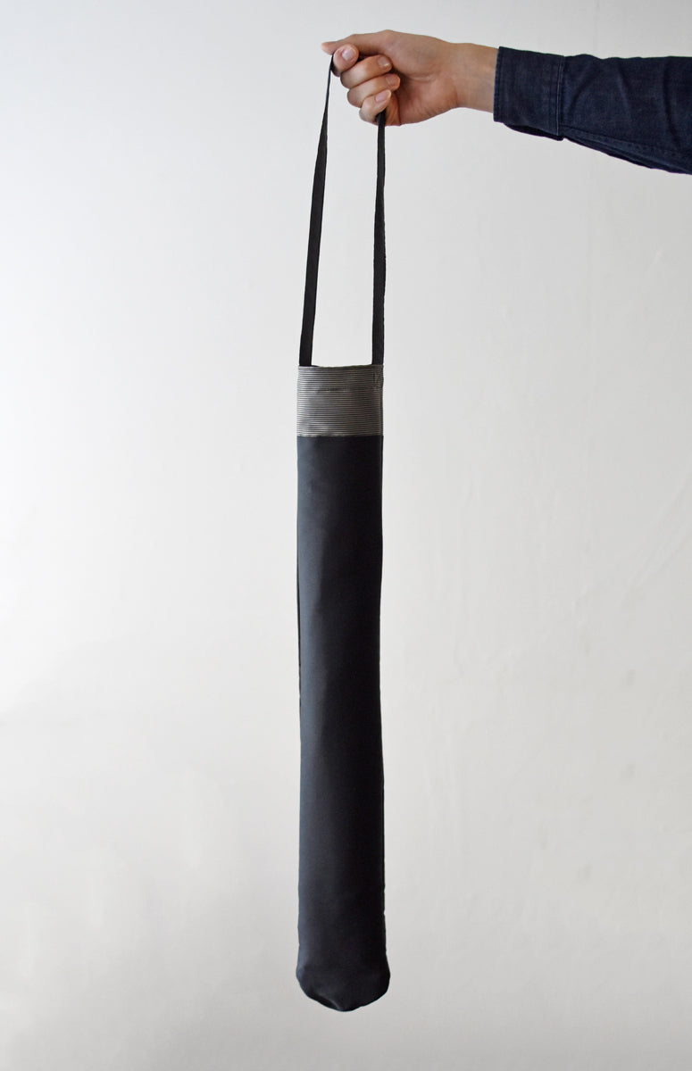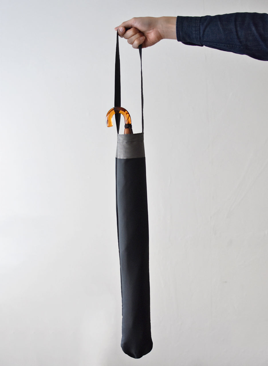 こちらの傘袋には、表は無地・裏は細かいボーダー柄になるように二重に織り上げた甲州織「裏縞」の生地を使用しています。裏地のさりげないボーダーが大人の雰囲気を醸し出す、ワンランク上のおしゃれをお楽しみいただけます。