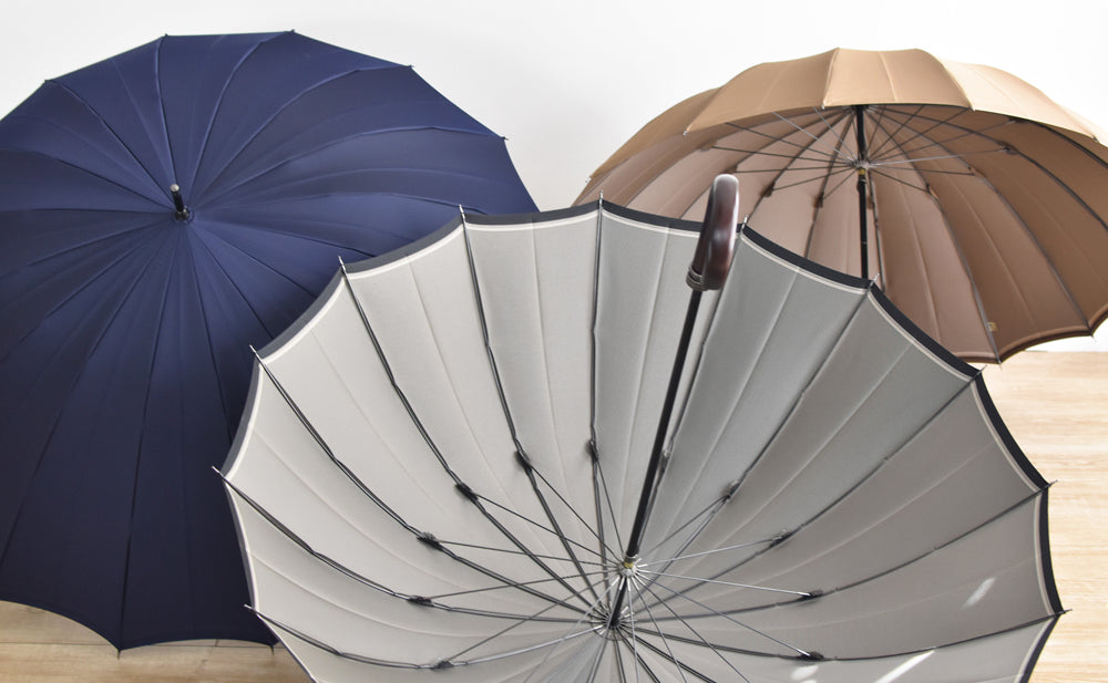 職人が丁寧に作り上げた傘の張りが16本骨の丸い形を引き立てる、美しいシルエットの長傘です。また骨が16本のため、丈夫で風に強いのが特徴ですが、カーボン骨を使用しているために軽いのが魅力です。