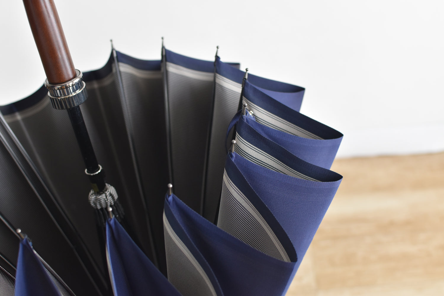 表は無地・裏は縞柄(ボーダー)になるように織り上げたスタイリッシュな甲州織の雨晴兼用長傘です。細かなボーダー柄がシックで大人なイメージを引き立てる、高級感あふれるデザインです。職人が丁寧に作り上げた傘の張りが16本骨の丸い形を引き立てる、美しいシルエットの長傘です。また骨が16本のため、丈夫で風に強いのが特徴ですが、カーボン骨を使用しているために軽いのが魅力です。